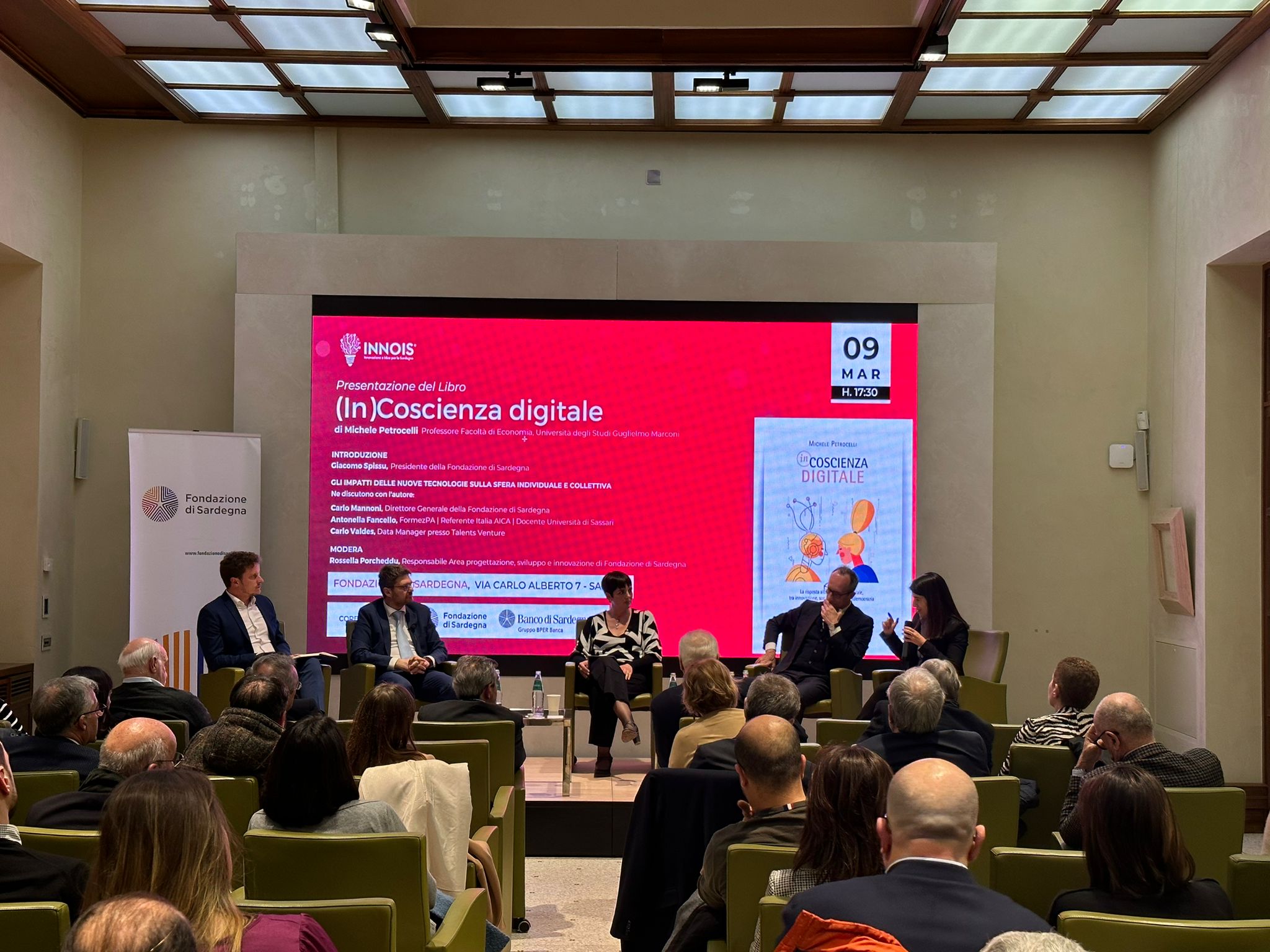 Sassari, 9 Marzo 2023 – Si è tenuto presso la sede della Fondazione di Sardegna, la presentazione del libro “(In)Coscienza Digitale. Gli impatti delle nuove tecnologie sulla sfera individuale e collettiva”, organizzato da Innois – Innovazione e Idee per la Sardegna e Banco di Sardegna S.p.A. L’incontro ha rappresentato un momento per dibattere con Giacomo Spissu Presidente della Fondazione Sardegna, Carlo Mannoni Direttore Generale della Fondazione di Sardegna, Antonella Fancello consulente senior di FormezPa, referente Italia AICA e docente dell’Università di Sassari, Carlo Valdes Data Manager presso Talents Venture delle tematiche care all’autore.